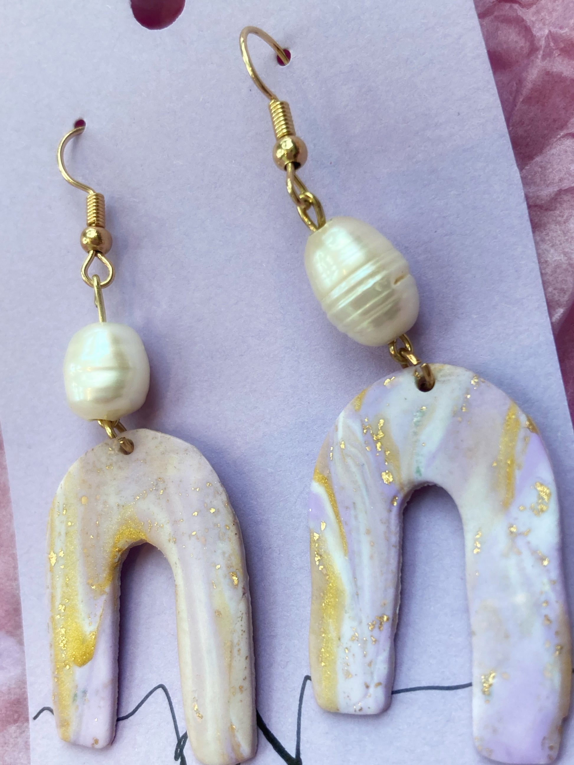 Materiaali: Polymeerisavi, lehtikulta/ hopea, kirurginteräs ja mahd. makeanveden helmi.